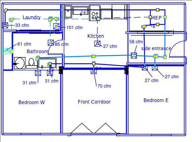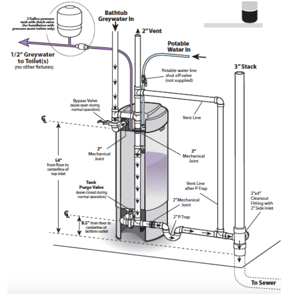 We intentionally created a home that minimizes piping and confined our plumbing area to the northern module where we concentrated the piping along a single ‘plumbing’ wall, effectively minimizing the area for water loss due to leakage. This brings our material costs down and provides fewer opportunities for thermal bridging and heat loss. We further reduce our water-footprint by choosing to integrate only low-flow appliances and fixtures. We pursued implementing three specific technologies into our water system with regards to water efficiency; solar-powered water heating systems, graywater reuse systems, and rainwater collection systems.
