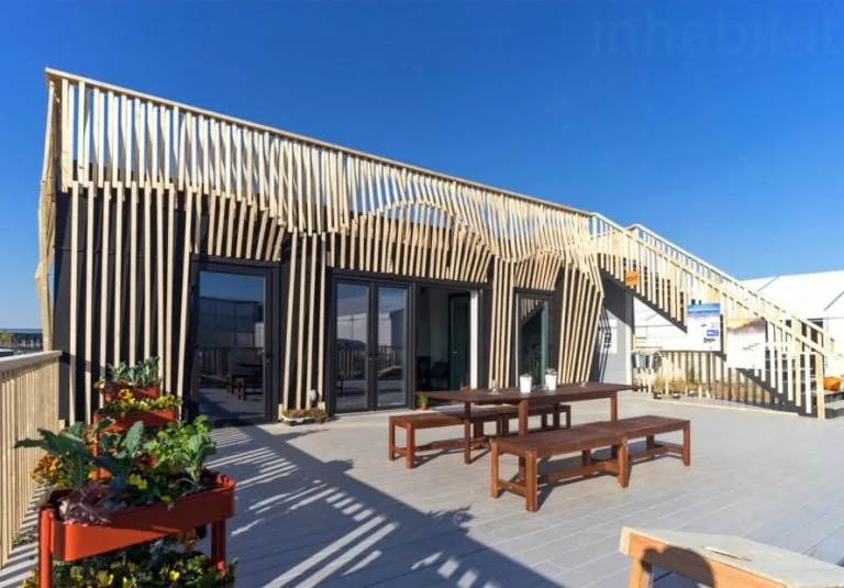 With a simple form to ensure ease of transportation, better thermal performance, and an affordable, stackable structure, we had to find complexity in our detailing. The façade design is a beautiful architectural feature that complements the rectilinear form of the base building — a parametrically designed wave of deliberately spaced wooden elements creates a dynamic interplay between light and shadow and tectonics and form and brings light and three-dimensional interest to the base structure.