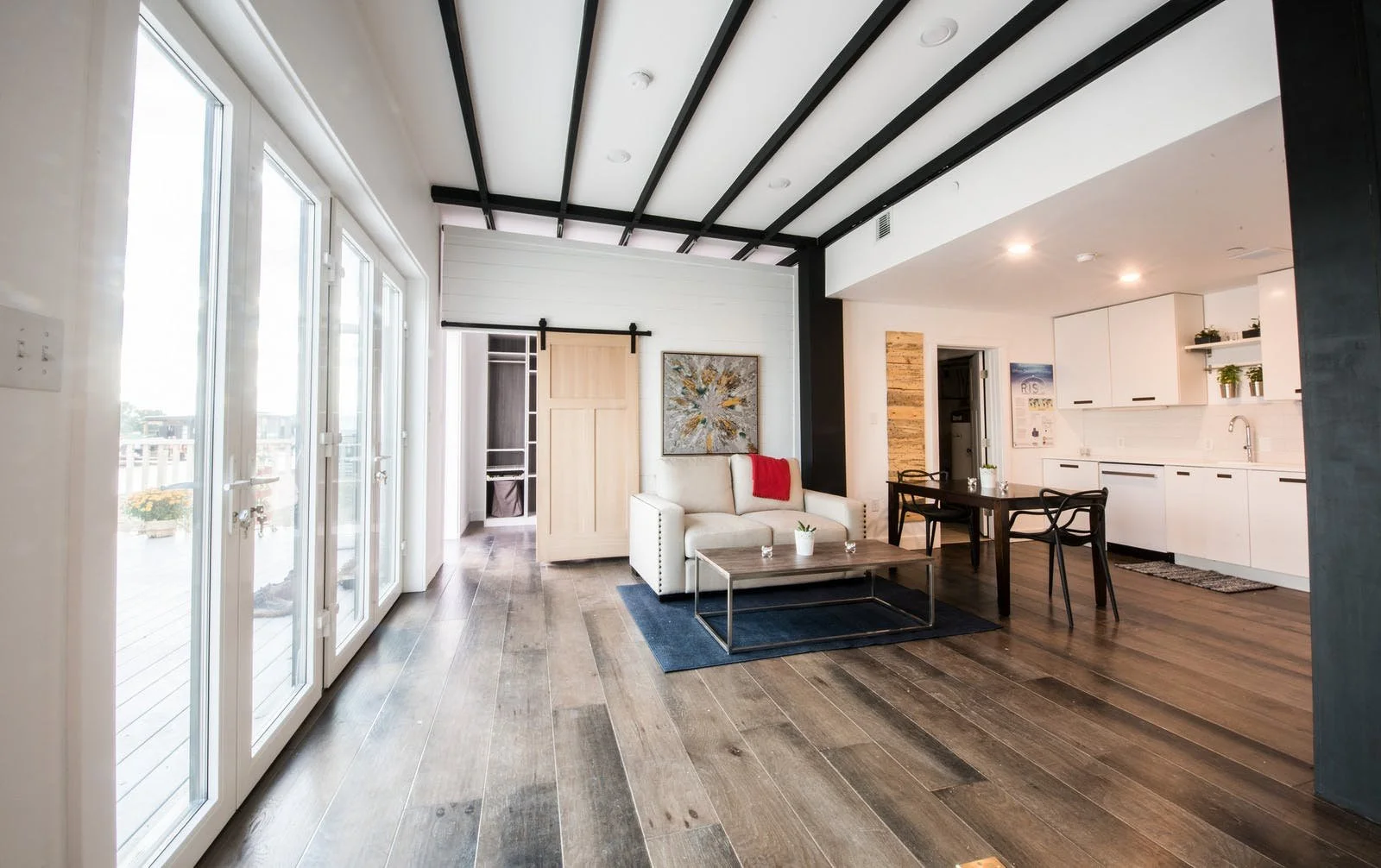 Murphy furniture in the bedrooms allow for versatility. Accompanied by moveable bedroom walls, the living room space can expand to almost 3 times the original square footage and the bedrooms are easily convertible to office spaces. For a community transitioning to a more urban setting, this element is extremely important to accommodate a diverse clientele. A light-wall transom in the west wall plumbing cavity allows for optical fibers to transport natural lighting outside of the house through a sealed cavity and spread across the bathroom west wall.