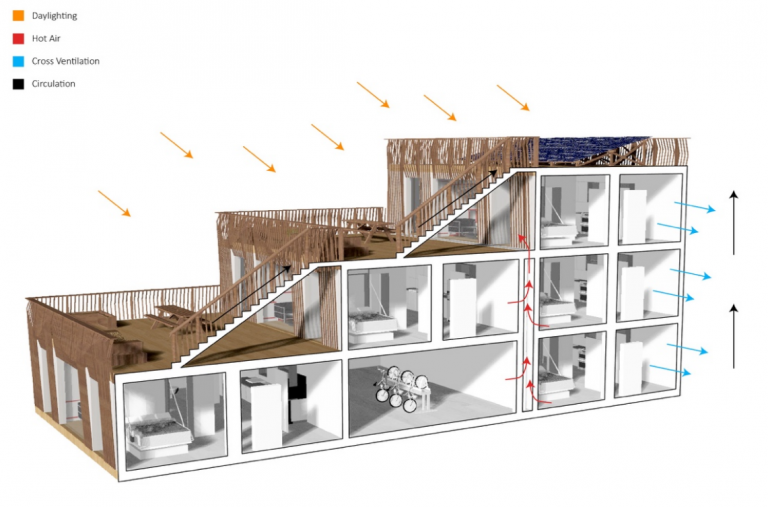 We achieve net-zero through no-frills systems and simple geometry, minimal pipe runs, and innovative energy systems. Using market standard technology with local, available materials to avoid special manufacturing and skilled labor. Instead of emphasizing smart technology, we highlighted simplicity for the reason of cost-effective products and low-budget maintenance.