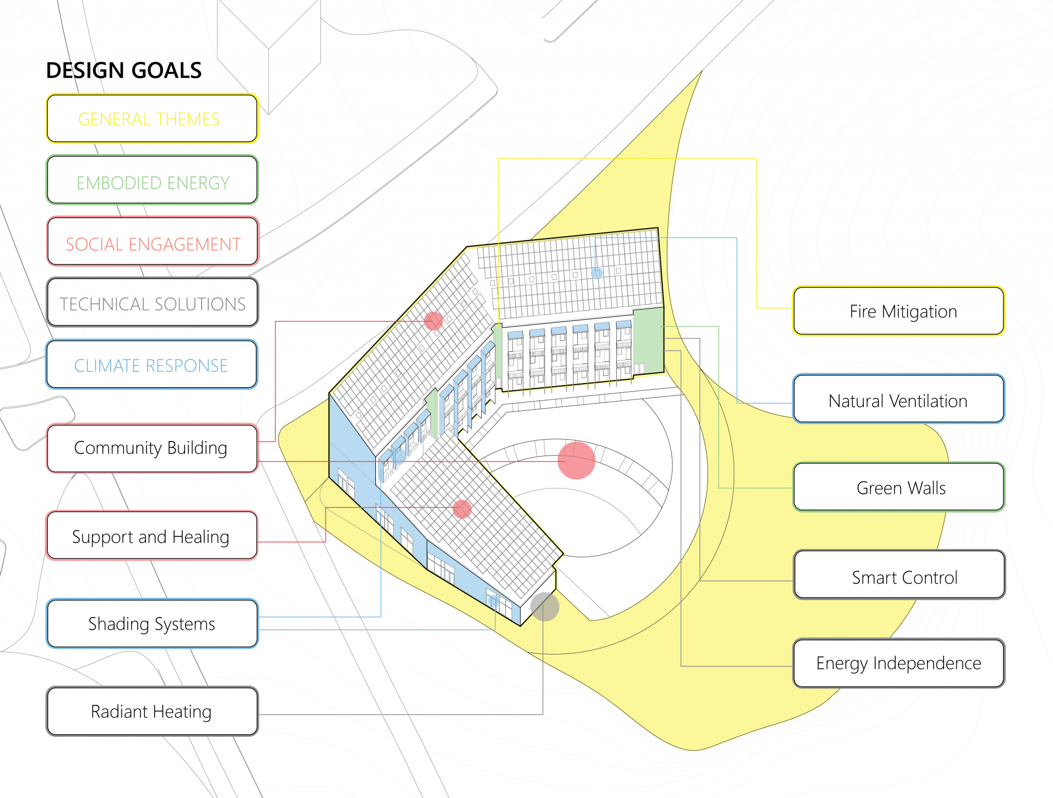 Our four-fold focus was on Fire Mitigation and Energy Independence, Social Responsibility and Practicality, Efficient Passive Systems, and Community Building and Healing.
